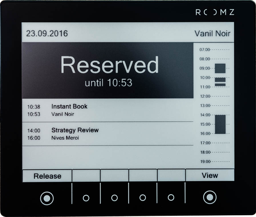 permet de founir la bonne information au bon moment tout en permettant aux employés de réserver une salle directement sur place. Fini les conflits et les incertitudes dans les couloirs.