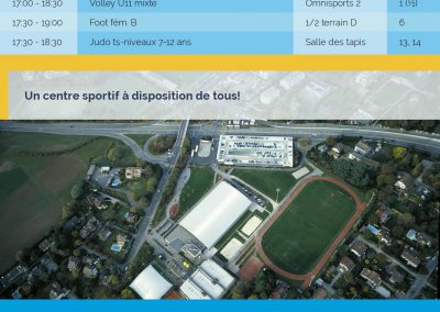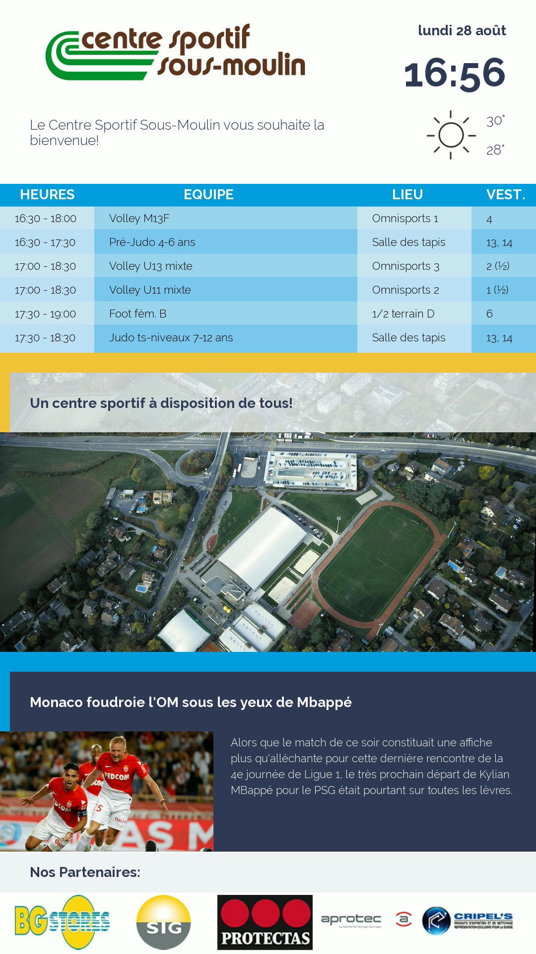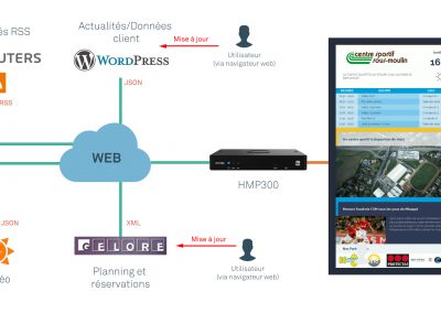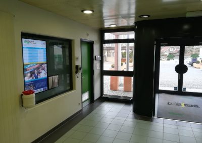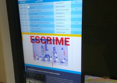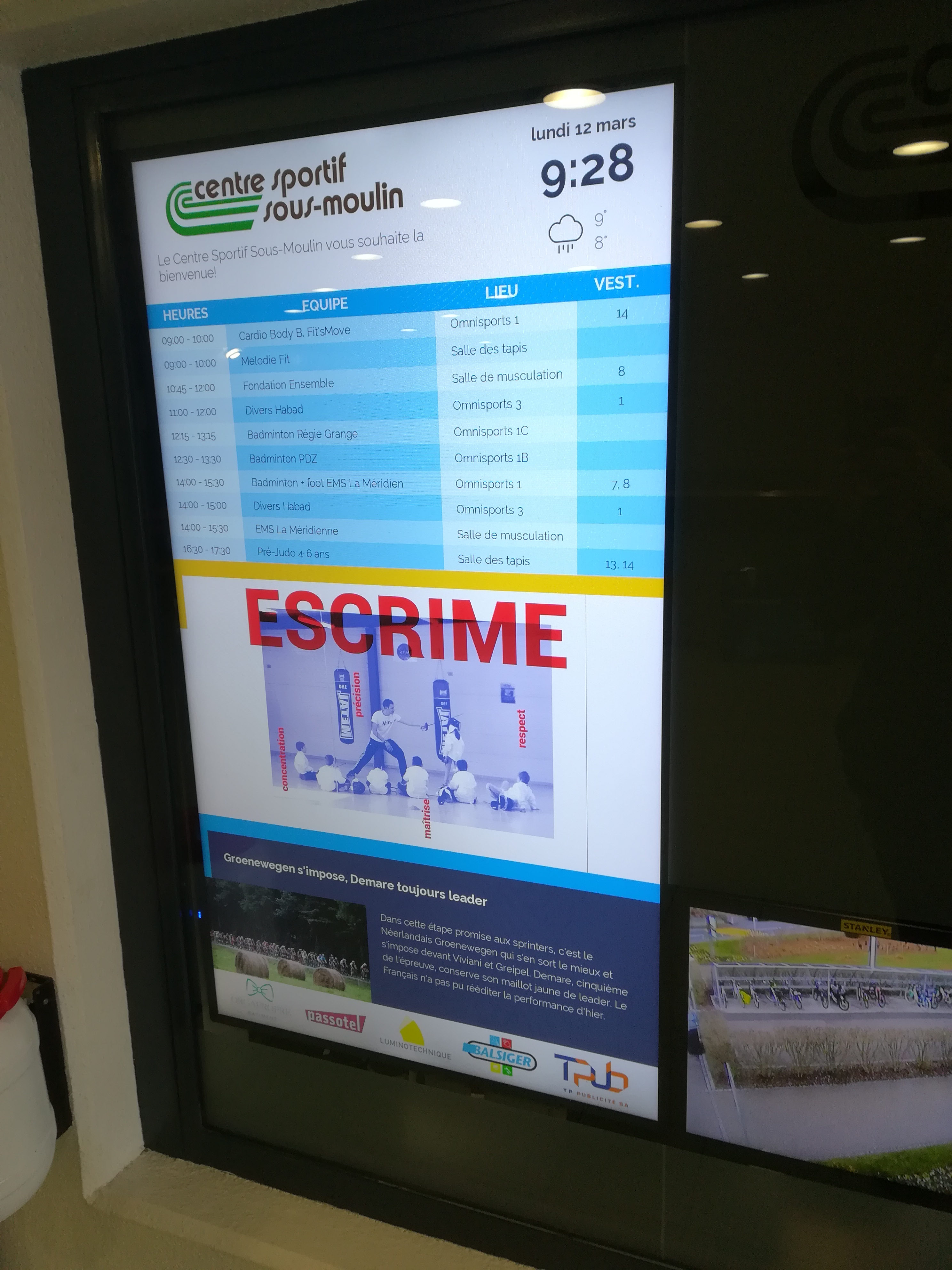 Grâce à un écran dynamique installé dans le hall d’accueil, le Centre sportif Sous-Moulin renseigne ses visiteurs en temps réel sur les prochaines réservations des salles de sports, terrains et vestiaires. Techniquement, les données sont synchronisées automatiquement depuis la plateforme de gestion des réservations (GELORE) afin d’éviter une “double-saisie”.