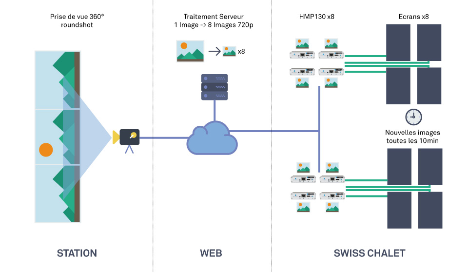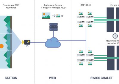Au restaurant Swiss Chalet à l’aéroport de Genève, 2 fausses fenêtres composées de 4 écrans chacune donnent l’illusion de la vue panoramique d’un paysage alpin, quasiment en temps réel. Nous avons mis en place un système de mise à jour régulière d’images depuis une caméra installée dans une station de ski.